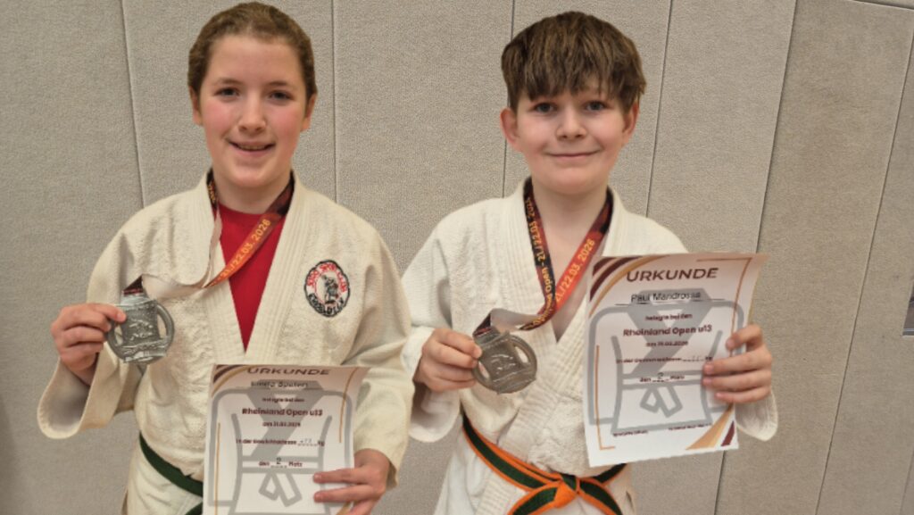 Am ersten Tag der Rheinland Open in Verlbert gewinnen Emilia Spelten (+57kg, U13) und Paul Mandrossa (-55kg, U13) die Silbermedaille nach einem verlorenen und einem gewonnenen Kampf. Während Emilia ihren Kampf knapp mit Kampfrichterentscheid gewann, da sie im Stand bessere Wurfansätze zeigte und sich im Griffkampf mehr durchsetzen konnte, siegte Paul in seiner zweiten Begegung durch Ippon mit seiner Lieblingstechnik O-goshi.