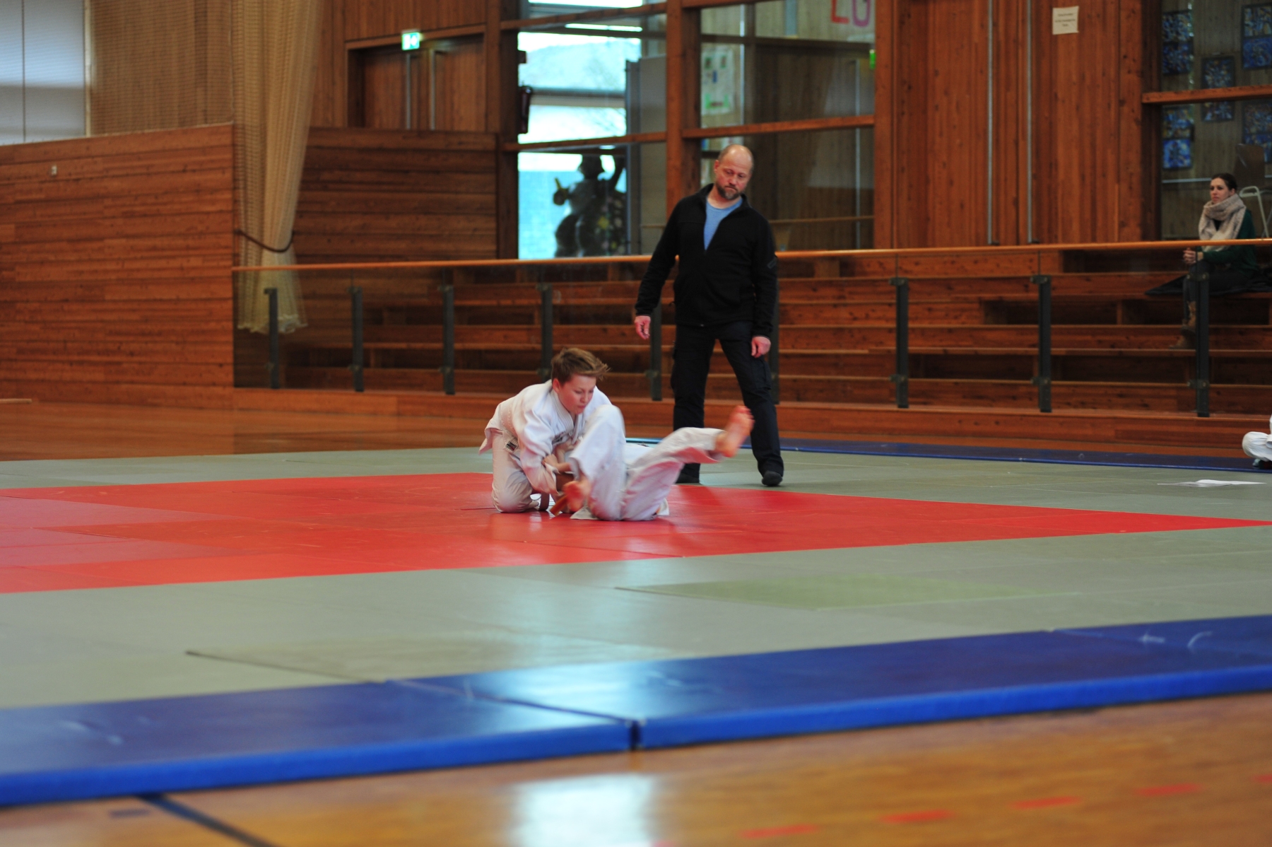 Nach kurzem Aufwärmen begann das Turnier. Insgesamt 19 aktive Judoka im Alter von 6-25 Jahren traten sich in den jeweiligen 3er und 4er Pools gegenüber, leider gab es auch ein paar krankheitsbedingte Ausfälle. Sofern aufgrund des Gewichts, Erfahrung und Alter nur zwei Kämpfer in einer Gruppe eingeteilt worden sind, kämpfte diese Gruppe in einem anderen Pool mit um mehr Kampferfahrung zu bekommen. Auch ein Spaßkampf der Erwachsenengruppe und mehrere Freundschaftskämpfe wurden nach den offiziellen Kämpfen durchgeführt. Die Einteilung anhand von Alter, Kyu-Grad, Gewicht und Erfahrung machte es beispielsweise auch möglich, dass auch die Jüngsten ihr Können in einem Bodenkampf zeigen konnten. Während der Kämpfe war eine gespannte Ruhe und die Kämpfer/innen wurden hinterher von ihren Vereinskameraden und Familien bejubelt und alle waren sehr motiviert eine gute Leistung zu zeigen.