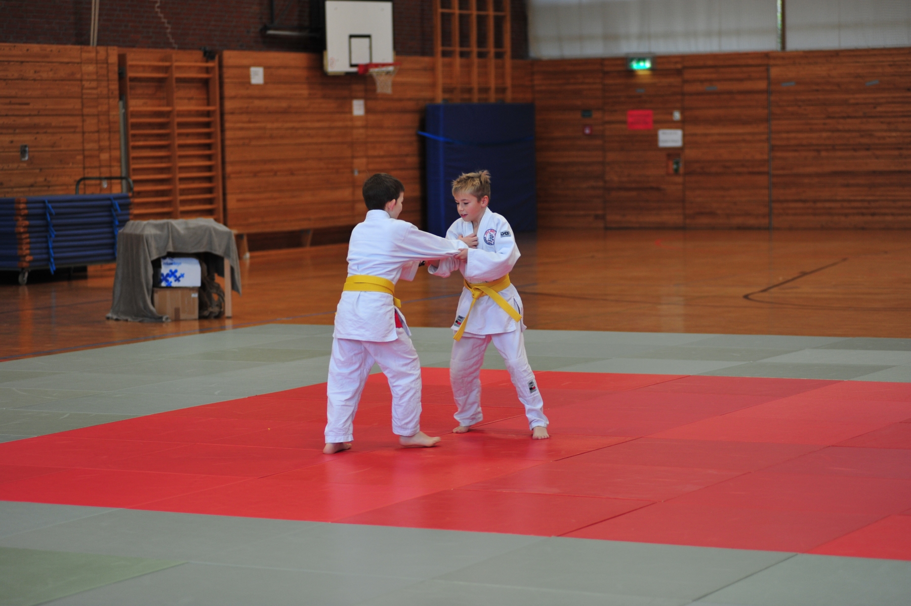 Nach kurzem Aufwärmen begann das Turnier. Insgesamt 19 aktive Judoka im Alter von 6-25 Jahren traten sich in den jeweiligen 3er und 4er Pools gegenüber, leider gab es auch ein paar krankheitsbedingte Ausfälle. Sofern aufgrund des Gewichts, Erfahrung und Alter nur zwei Kämpfer in einer Gruppe eingeteilt worden sind, kämpfte diese Gruppe in einem anderen Pool mit um mehr Kampferfahrung zu bekommen. Auch ein Spaßkampf der Erwachsenengruppe und mehrere Freundschaftskämpfe wurden nach den offiziellen Kämpfen durchgeführt. Die Einteilung anhand von Alter, Kyu-Grad, Gewicht und Erfahrung machte es beispielsweise auch möglich, dass auch die Jüngsten ihr Können in einem Bodenkampf zeigen konnten. Während der Kämpfe war eine gespannte Ruhe und die Kämpfer/innen wurden hinterher von ihren Vereinskameraden und Familien bejubelt und alle waren sehr motiviert eine gute Leistung zu zeigen.