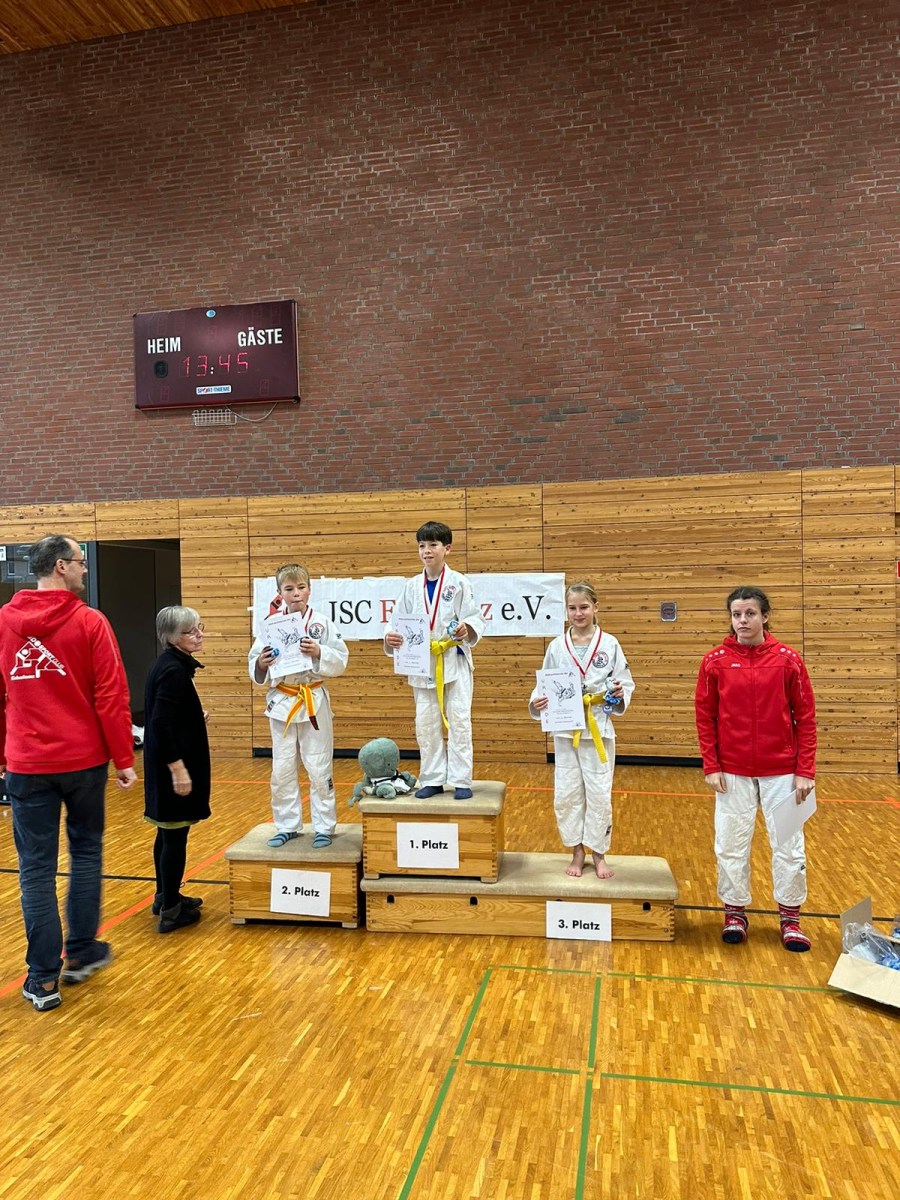 Teilnahme am Training mit Sportbeuteln in Vereinsfarbe belohnt: Weiter so, Kerem, Gleb, Alex und Felix! Dann wurde auch die langersehnte Rangliste der Kindergruppe, für ein besonders, erfolgreiches Wettkampfjahr 2023, bekannt gegeben. Alexander Holz wurde mit dem 3. Platz, Paul Mandrossa mit dem 2. Platz und Fynn Kretschmer mit dem 1. Platz geehrt. Neben den Pokalen und den Rückenschildern für den Judoanzug für Alex und Paul, erhielten alle Drei auch eine Sporttasche in Vereinsfarbe für kommende Wettkämpfe im neuen Jahr.