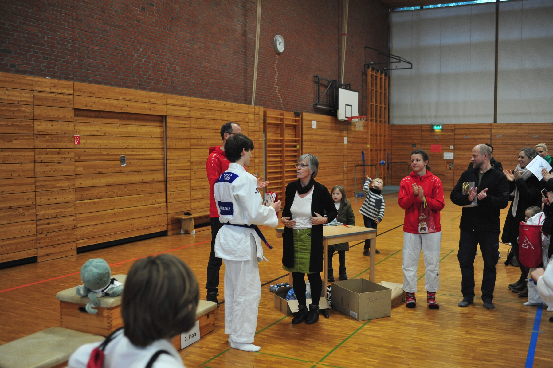 Eine gespannte Ruhe war innerhalb der Kämpfe. Besonders schön war, mit anzusehen, dass alle sehr motiviert und mit großem Siegeswillen in die Begegnungen reingingen. Jeder einzelne Kampf und Sieg wurde mit Beifall der Trainingskameraden und Familien belohnt. Insgesamt waren es sehr spannende Kämpfe mit teilweise sehr knappen, aber auch deutlichen Siegen, schönen Ippons und großem Kampfgeist. Bei der Siegerehrung gab es zur großen Freude Medaillen, Urkunden und einen kleinen Oktopus-Schlüsselanhänger (kleines Maskottchen). Auch wurden 4 Kinder für die aktivste