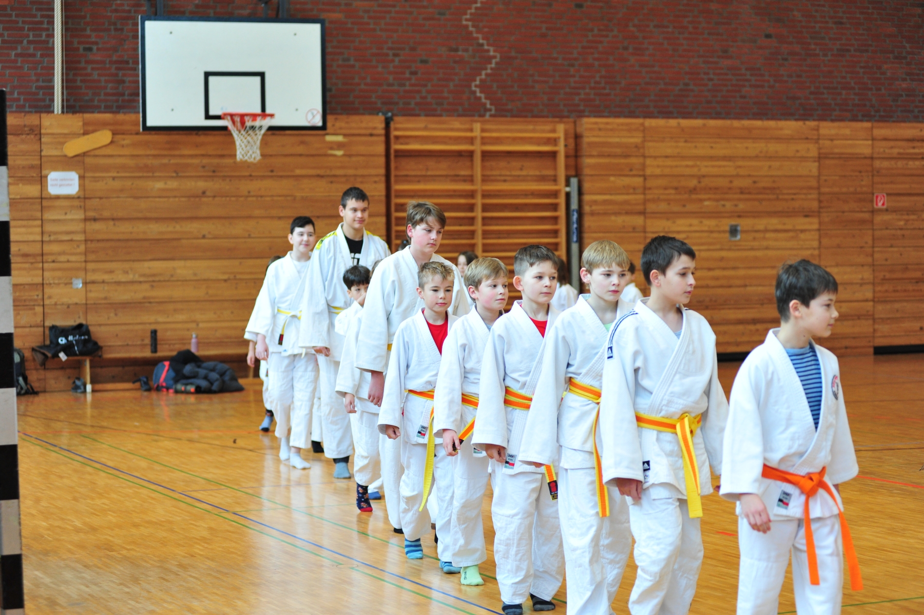 Nach unserem traditionellen Einlaufen mit Musik und Aufwärmen starteten die Jüngsten das Turnier. Alle Judoka wurden zuvor in 2er, 3er und 4er-Pools eingeteilt: nach Alter, Kyu-Grad und Erfahrung. Hinterher gab es sogar noch ein paar Freundschaftskämpfe außerhalb der Pools. Somit konnte jeder Einzelne mehrmals kämpfen und sein Können zeigen.